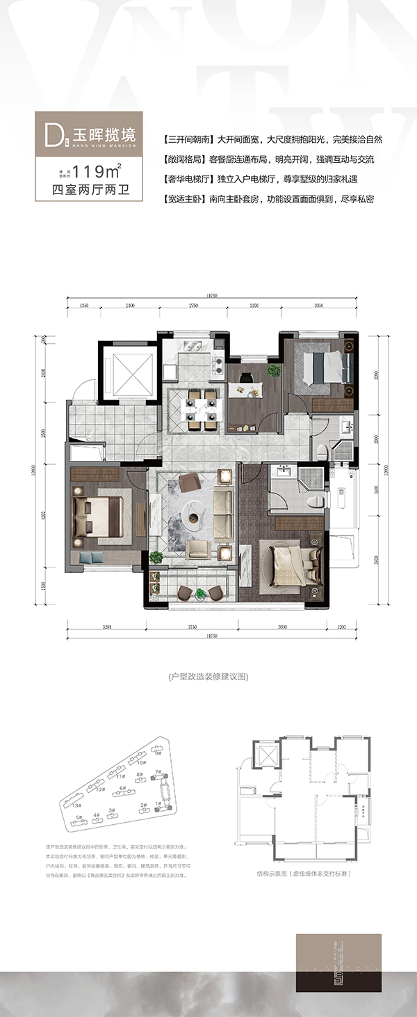 D户型 面积:119㎡ 售价:来电咨询 朝向:南
