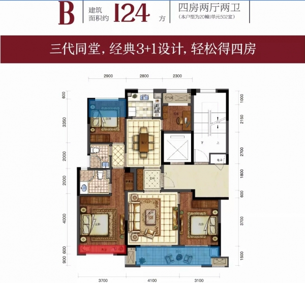 - B户型124㎡四室两厅两卫 面积:124㎡ 售价:来电咨询 朝向:来电咨询