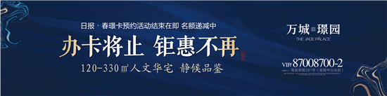目前,万城·璟园展示中心已正式开放,建面约120-165㎡学府宽邸,建面约330㎡风华逸墅,全城预约中!日报·春璟卡从开办起就热追不断,目前开盘在即,办理即将截止,欲办从速!更多钜惠可前往万城·璟园展示中心咨询了解!