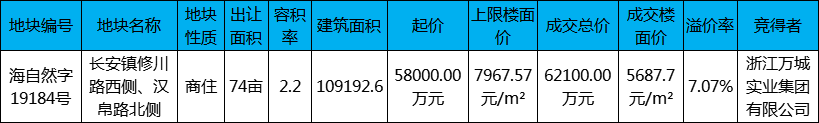 该地块位于长安镇修川路西侧、汉帛路北侧,出让面积49633㎡,容积率2-2.2,建筑面积109192.6㎡。最终经过42轮竞价,由浙江万城实业集团有限公司竞得,成交总价62100.00万元,成交楼面价5687.7元/2,溢价率7.07%。