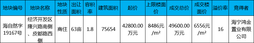 地块位于经济开发区隆兴路南侧、皮迎金路南侧、双学路西侧都路西侧,出让面积42030㎡,容积率1.5-1.8,建筑面积75654㎡。经过67轮竞价,最终由海宁鸿金置业有限公司夺得,成交总价49600.00万元,成交楼面价6556元/2,溢价率16%。