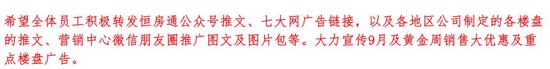 值得一提的是,此次恒大在员工推荐购房方面对于员工的奖励也比以往的力度要大。文件内容显示,若客户交齐首期款签署合同之后,除原有1%佣金给予员工额外1%佣金奖励,即按成交总额的2%计发佣金。