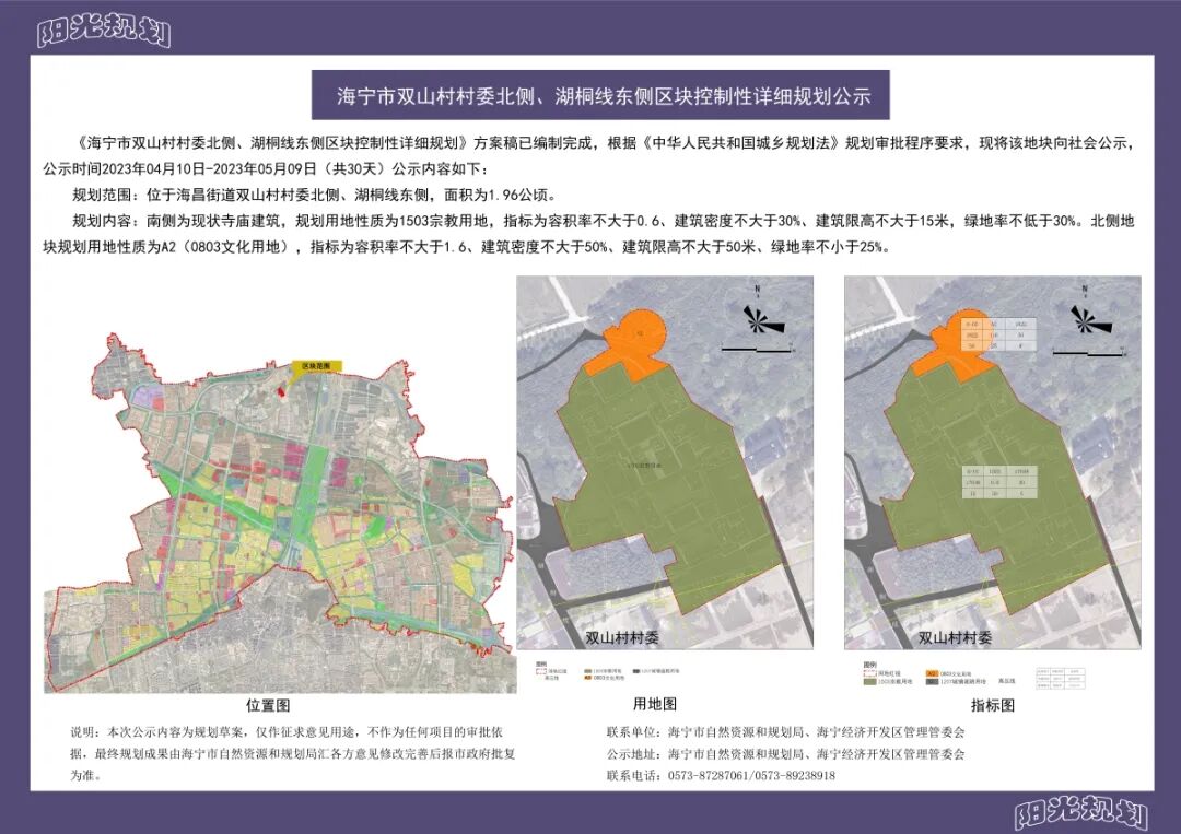 地块具体位置是在海昌街道双山村村委北侧、湖桐线东侧面积为1.96公顷南侧为寺庙建筑新规划的地块为宗教用地容积率不大于0.6,建筑密度不大于0.6建筑限高不大于15米绿地率不小于30%北侧为文化用地容积率不大于1.6,建筑密度不大于0.6建筑限高不大于50米绿地率不小于30%海宁房产楼市粉丝群信息来源:海宁市自然资源与规划局