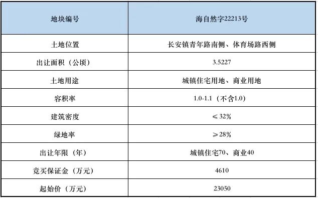 这个地块位于长安镇青年路南侧、体育场路西侧 土地面积3.5227公顷 是城镇住宅用地、商业用地 容积率1.0-1.1(不含1.0) 现场照片 出让年限城镇住宅70年、商业40年 起始价23050万元 区位图 2 ✦ 海自然字22186号