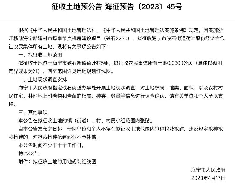 因实施浙江移动海宁新建材市场南节点机房建设项目(硖石2230),拟征收海宁市硖石街道荷叶股份经济合作社农民集体所有土地。