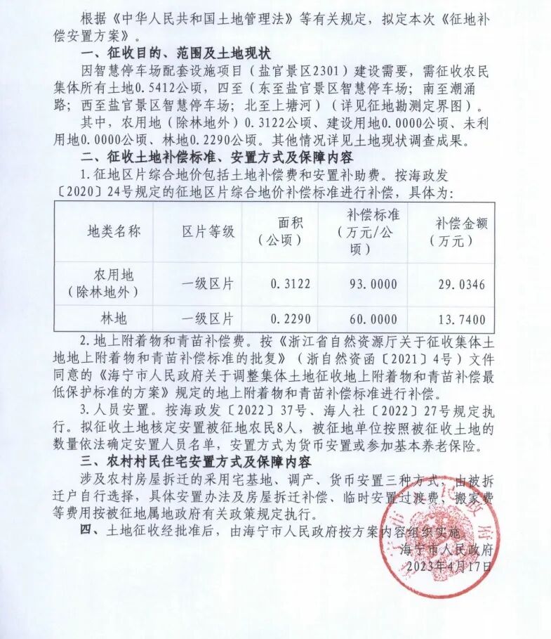 摘要:01征地补偿安置公告海征补告〔2023〕27号因智慧停车场配套设施项目(盐官景区2301)建设需要,拟征收海宁市周王庙镇荆山股份经济合作社农民集体所有土地0.5412公顷。补偿标准是农用地每公顷93万元,补偿29.0346万元林地类每公顷93万元,补