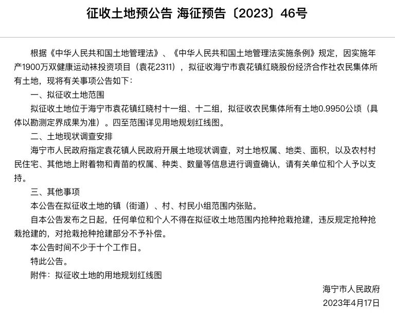 因实施年产1900万双健康运动袜投资项目(袁花2311),拟征收海宁市袁花镇红晓股份经济合作社农民集体所有土地。