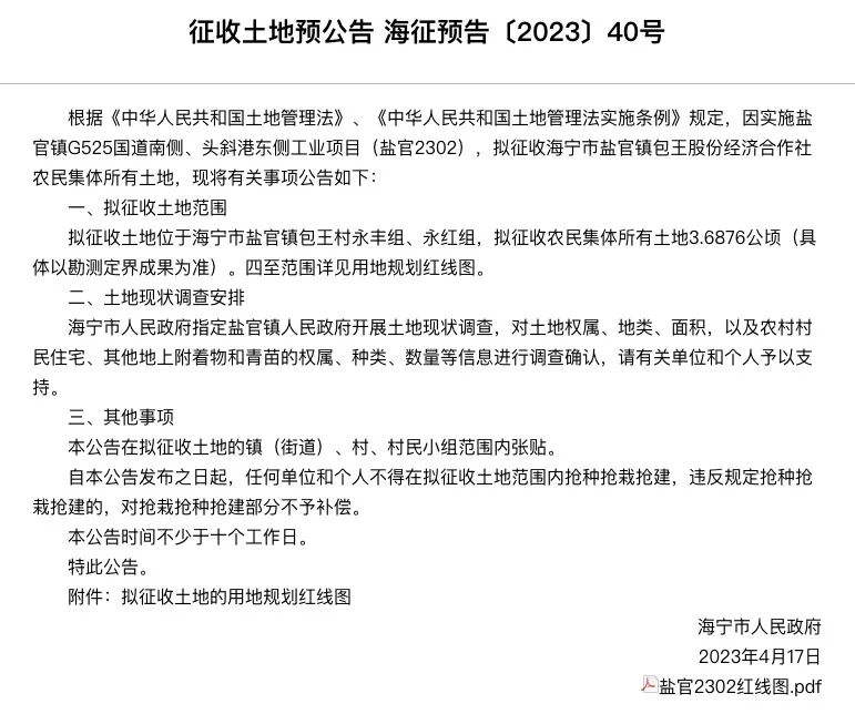 因实施盐官镇G525国道南侧、头斜港东侧工业项目(盐官2302),拟征收海宁市盐官镇包王股份经济合作社农民集体所有土地。