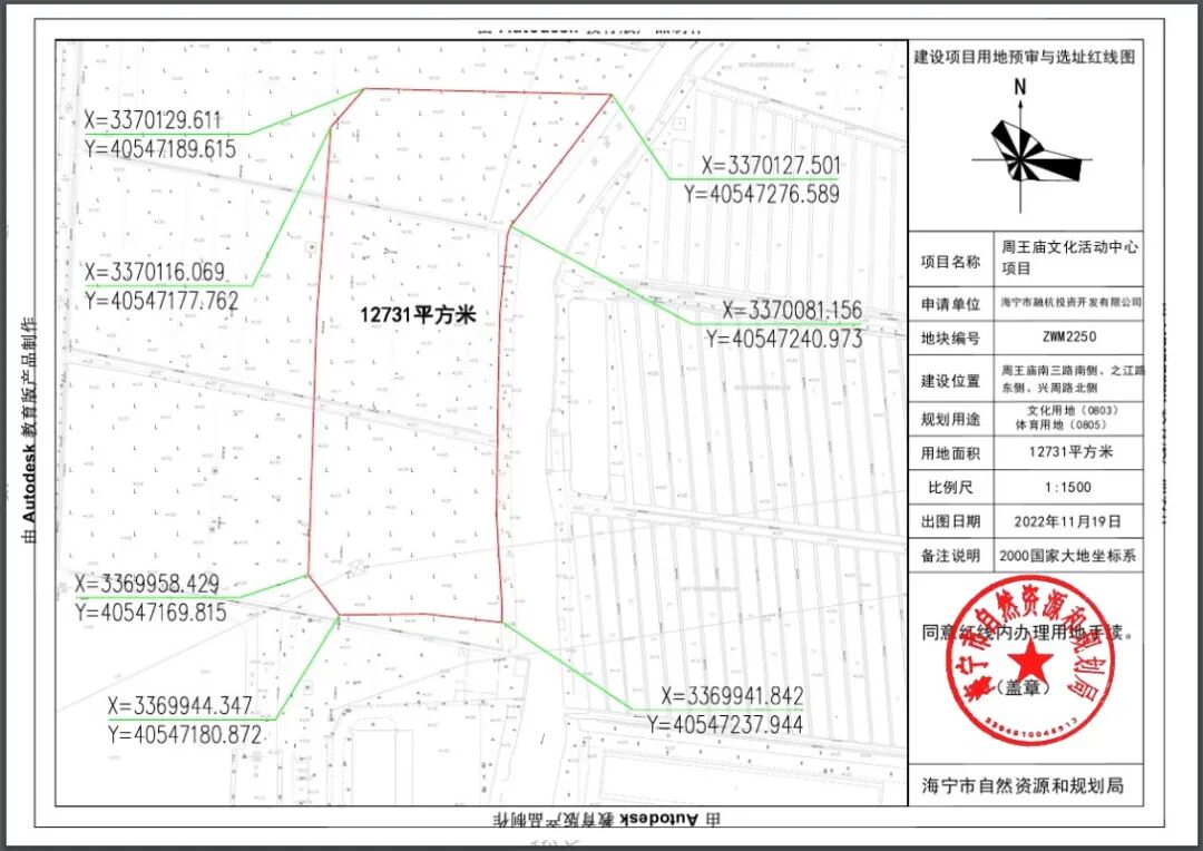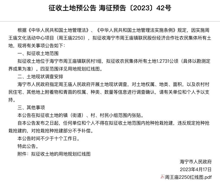 因实施周王庙文化活动中心项目(周王庙2250),拟征收海宁市周王庙镇联民股份经济合作社农民集体所有土地。