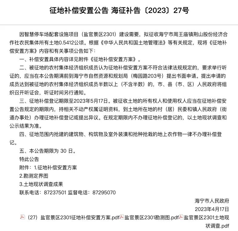 因智慧停车场配套设施项目(盐官景区2301)建设需要,拟征收海宁市周王庙镇荆山股份经济合作社农民集体所有土地0.5412公顷