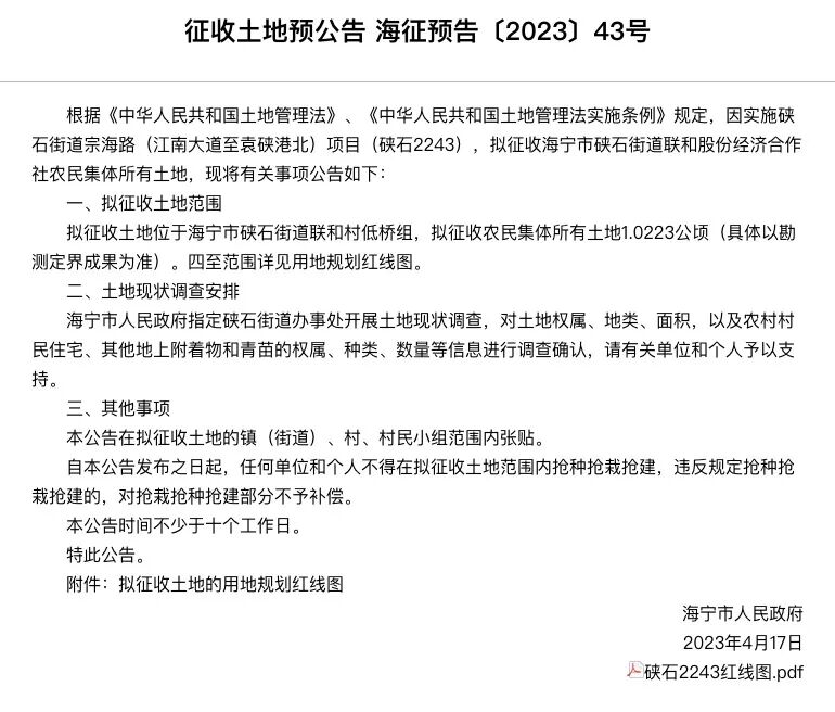 因实施硖石街道宗海路(江南大道至袁硖港北)项目(硖石2243),拟征收海宁市硖石街道联和股份经济合作社农民集体所有土地。