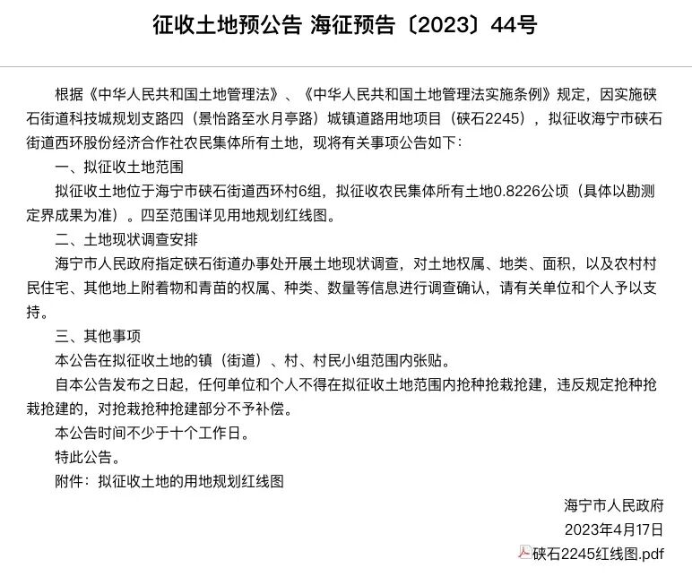 因实施硖石街道科技城规划支路四(景怡路至水月亭路)城镇道路用地项目(硖石2245),拟征收海宁市硖石街道西环股份经济合作社农民集体所有土地。