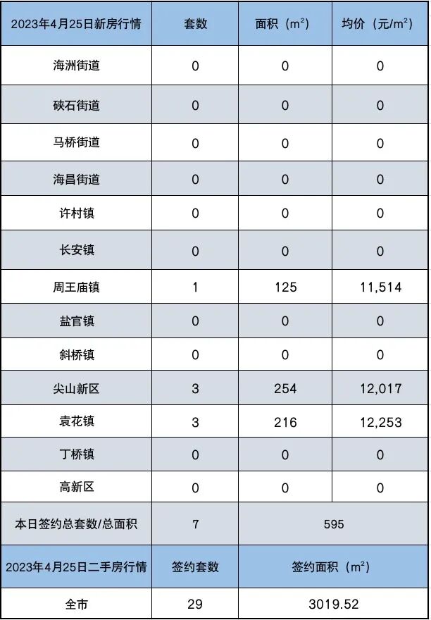 新房签约7套,尖山和袁花各签约3套,周王庙签约1套,总签约面积595平方米。二手房签约29套,签约面积3019.52平方米。