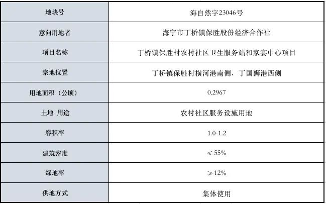 这块地的位置是在 丁桥镇保胜村横河港南侧、丁国狮港西侧 用地面积0.2967公顷 是农村社区服务设施用地 容积率为1.0-1.2 供地方式是集体使用