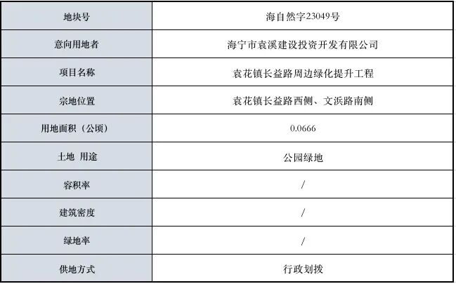 这块地的位置是在 袁花镇长益路西侧、文浜路南侧 用地面积0.0666公顷 是公园绿地 供地方式是行政划拨