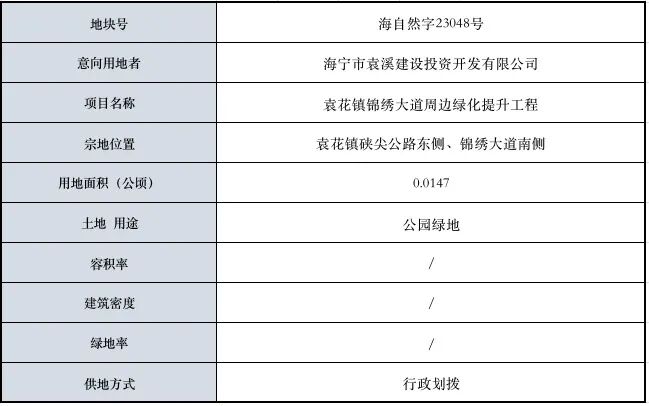 这块地的位置是在 袁花镇硖尖公路东侧 锦绣大道南侧用地 面积0.0147公顷 是公园绿地 供地方式是行政划拨